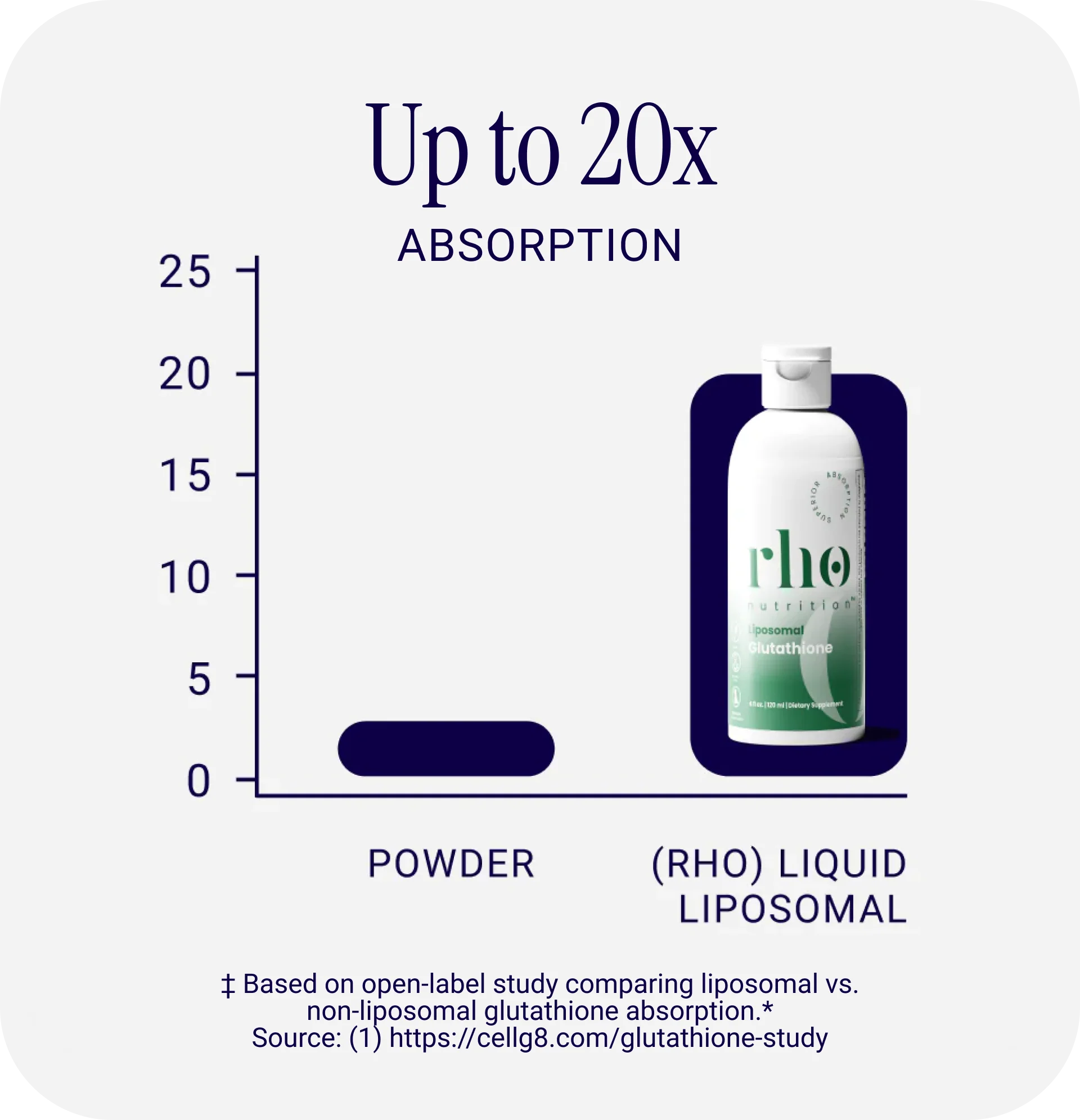 Rho's liquid liposomal glutathione has been shown in an open-label study to offer up to 20x greater absorption into the bloodstream compared to non-liposomal powder forms, supporting more efficient nutrient delivery and availability.‡